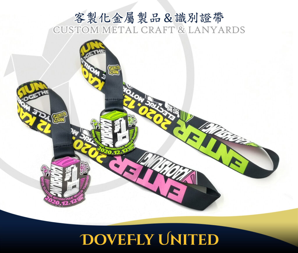 一面設計完整的獎牌,織帶的圖案印刷佔據非常重要的視覺效果。德弗聯合義大利進口熱轉印織帶印刷系統,織帶顏色與獎牌烤漆顏色精準契合,為了能替客戶做出別具風格又有意義的獎牌,德弗聯合團隊累積二十年豐富各式獎牌專業訂製案例,針對客戶需求、預算、時間,提出最適合客戶採購的製作建議。工廠內有眾多客製化專屬獎牌案例可供參考,包含有:運動獎牌、馬拉松獎牌、技能獎牌、冠軍獎牌、金銀銅牌、名次獎牌、榮譽獎牌等,2D/3D模具皆可製作,搭配高質感熱轉印刷全彩織帶,或素色頸掛繩及各式吊繩配件種類尺寸齊全,精湛品質完善服務,最低訂購量:100pcs免製稿費。專業優質的獎牌客製化訂做,推薦您選擇品質優良口碑極佳的德弗聯合(DoveFly United)專業獎牌製造商!