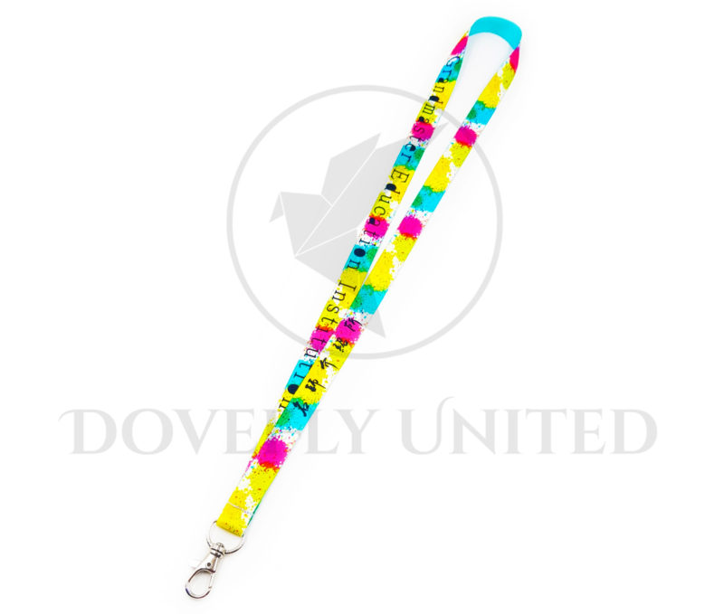 哈!雖然答案顯而易見,但有時候因為太熟悉反而會沒有注意到。就是這條頸掛繩織帶印刷的顏色,直接使用了印刷四原色C、M、Y、K的圖案與文字就完成了。不過看似簡單,各位朋友可以試試看,如果拿出色票,把這四個顏色湊在一起,怎麼看怎麼怪,但是當設計師使用了顏料隨興滴落的感覺來設計,各顏色交疊處會再產生一個新的顏色,但是因為只有兩色交疊,所以透明度很夠,整體視覺清爽不亂。並且設計師巧妙地讓黃色份量多一點,跳脫C、M、Y、K原色並列時的詭異,這就形成了像照片中繽紛燦爛,還帶點可愛感覺的訂製證件套頸掛繩了。