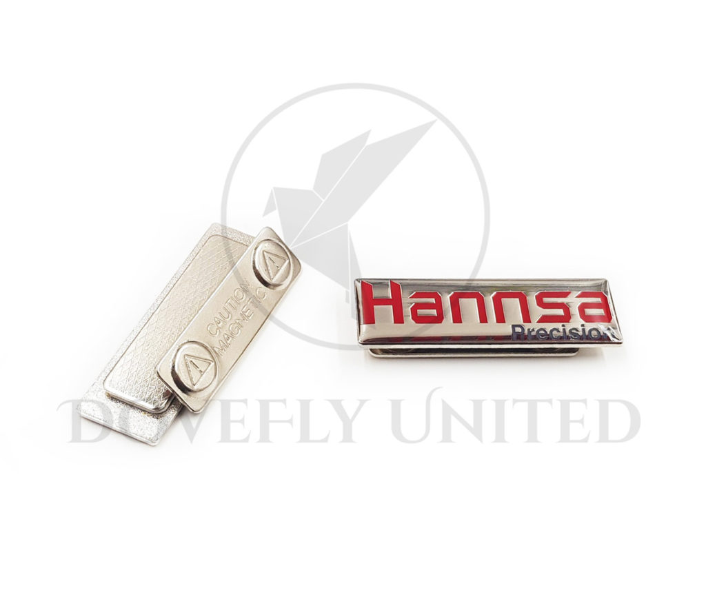 高質感企業金屬名牌的基本款式,為橫式銘版背面加上別針,考慮到配合不同服裝,也可採用安全簡便的強力磁鐵吸夾方式固定。表面加上波麗滴膠,形成晶瑩光滑有如玻璃折射,具有放大Logo的效果。德弗聯合客製化的名牌胸章,可以搭配以下多種配件來固定在衣服上: