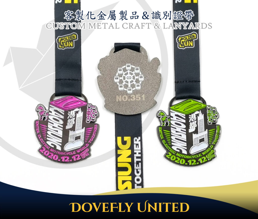 一面設計完整的獎牌,織帶的圖案印刷佔據非常重要的視覺效果。德弗聯合義大利進口熱轉印織帶印刷系統,織帶顏色與獎牌烤漆顏色精準契合,為了能替客戶做出別具風格又有意義的獎牌,德弗聯合團隊累積二十年豐富各式獎牌專業訂製案例,針對客戶需求、預算、時間,提出最適合客戶採購的製作建議。工廠內有眾多客製化專屬獎牌案例可供參考,包含有:運動獎牌、馬拉松獎牌、技能獎牌、冠軍獎牌、金銀銅牌、名次獎牌、榮譽獎牌等,2D/3D模具皆可製作,搭配高質感熱轉印刷全彩織帶,或素色頸掛繩及各式吊繩配件種類尺寸齊全,精湛品質完善服務,最低訂購量:100pcs免製稿費。專業優質的獎牌客製化訂做,推薦您選擇品質優良口碑極佳的德弗聯合(DoveFly United)專業獎牌製造商!