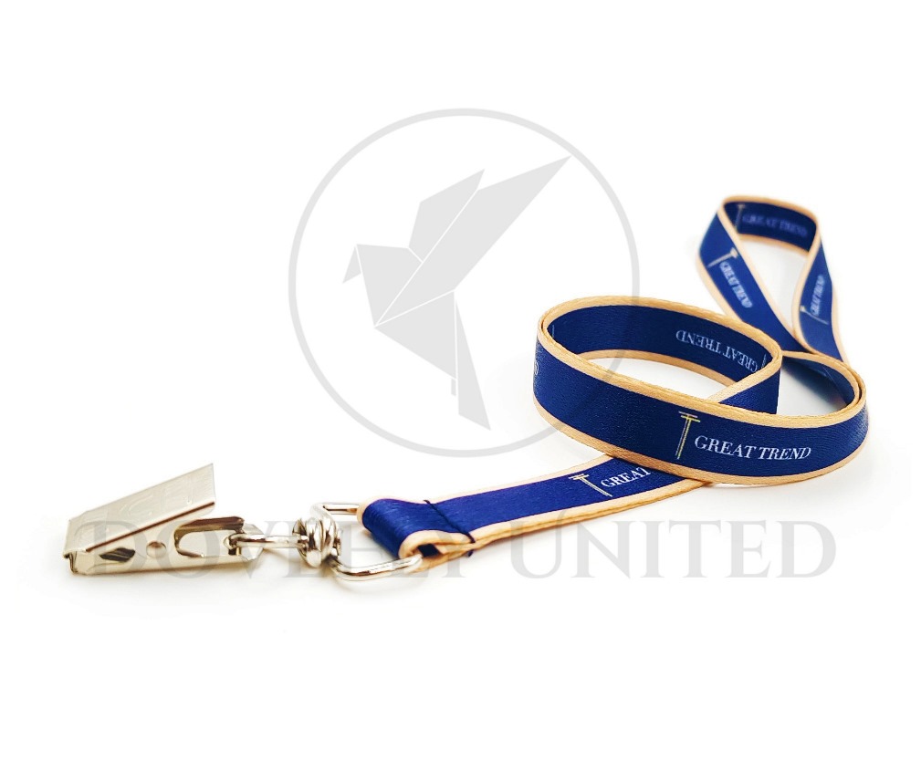 其實是可以的,透過材質選用以及線條配色,頸掛繩本身還沒有印上Logo圖案之前,就已經具備基本的個性囉!比如照片裡這一條德弗聯合出品的頸掛繩,客戶品牌名稱「GREAT TREND」使用了古典襯線字體,呈現出一種典雅的感覺,而頸掛繩使用藍色的織帶,兩側加上了金黃色邊的配色,而下方證件套夾子也是選用了銅黃色的金屬夾,因此整體呈現出了一種古典又高貴的感覺。一些精品名牌推出的手環,也是使用這樣了的配色。許多古老的經書上,也會見到使用金色顏料將文字與圖案,書寫在深藍色或藏青色的紙上,在古時候昏暗的燭光環境底下,正好因為顏色的對比而能清晰呈現,方便閱讀。