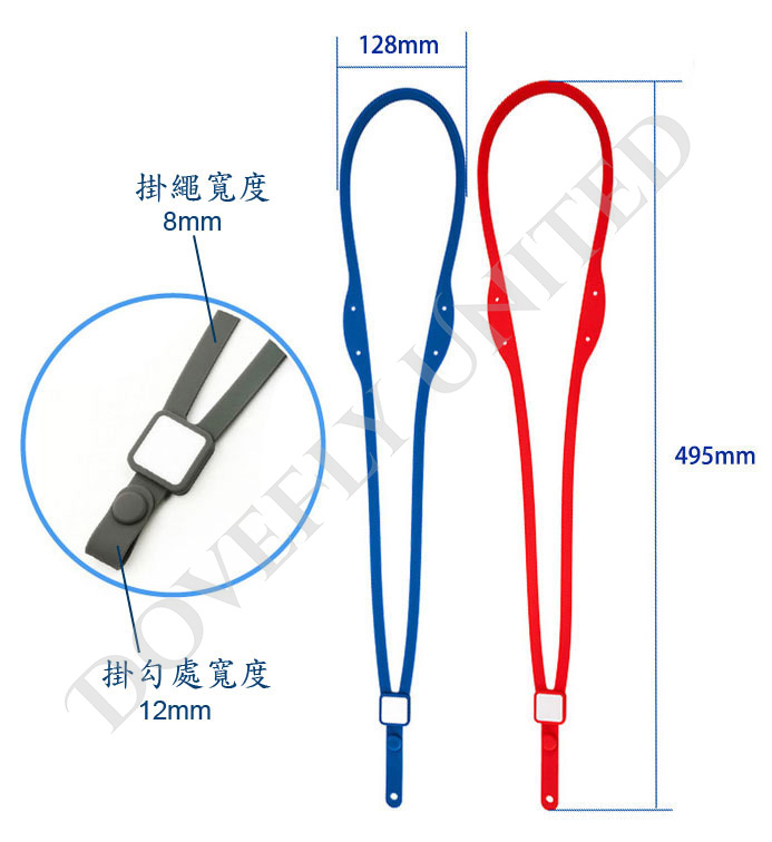 掛繩採用矽膠環保材質,表面特殊處理,耐髒、手感舒適。前方掛扣,採用方形設計,白色基調,突顯美感。