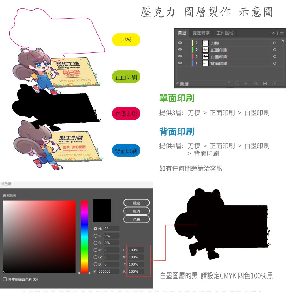 壓克力成品圖中正反兩面,背面需鏡像反轉成品文字才會正向。