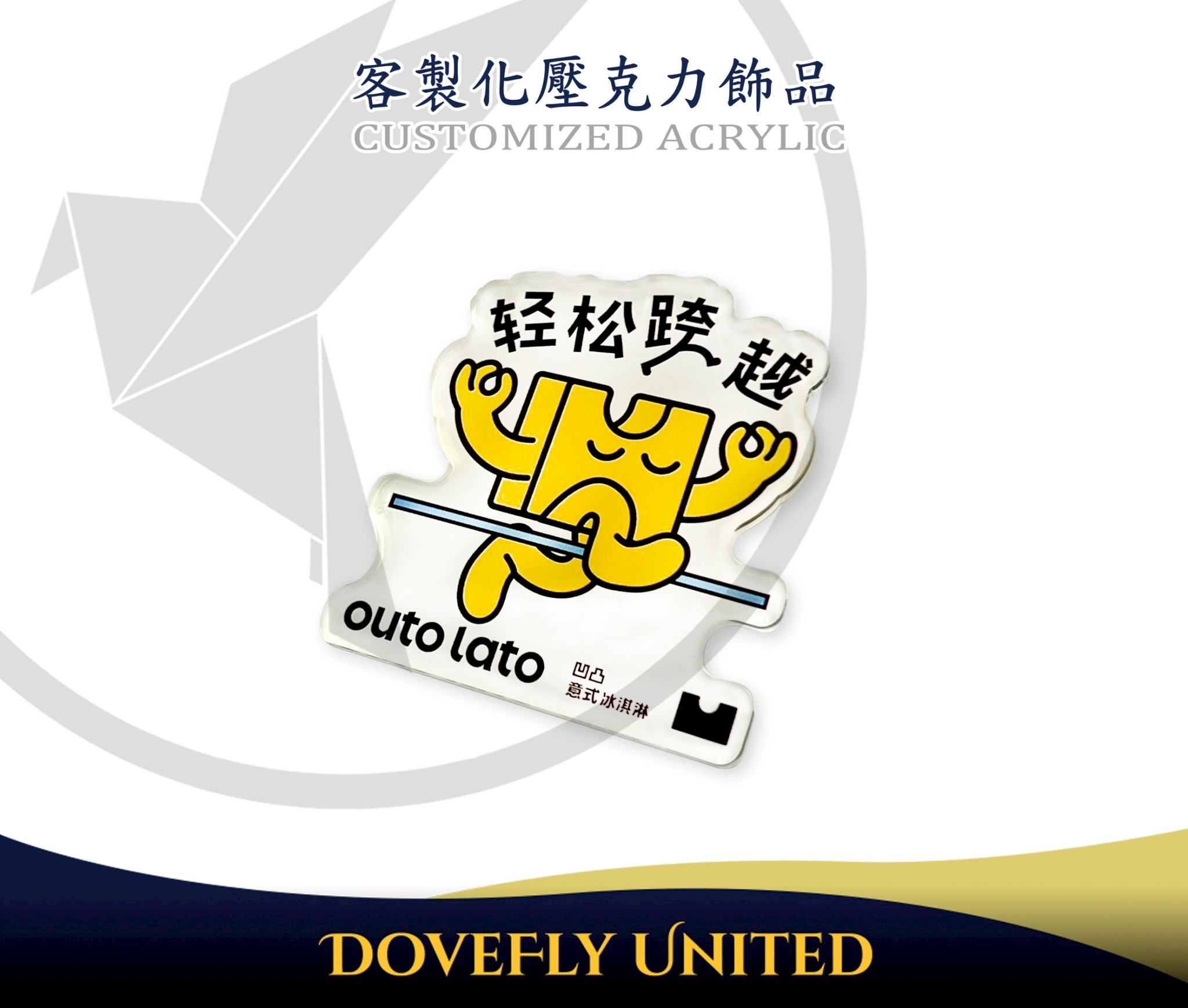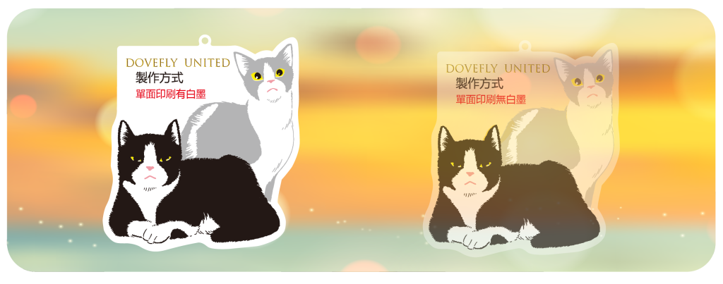 以單一片壓克力完成品表面再上透明膠,經固化後可達到保護圖樣(避免掉色)表面會形成微微弧度,提高耐用度。