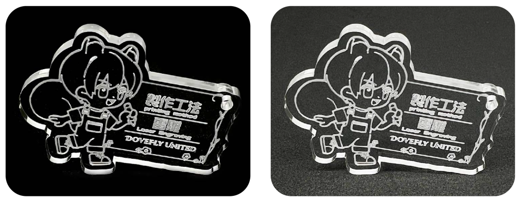 以單一片壓克力製圖再上雷射,也可做兩層壓克力將把雷射在中間如是單層的雷雕可摸得到紋路。