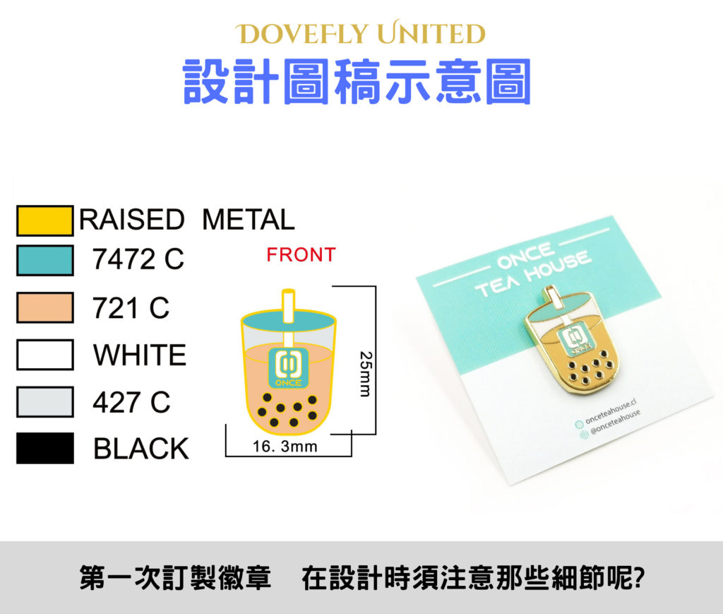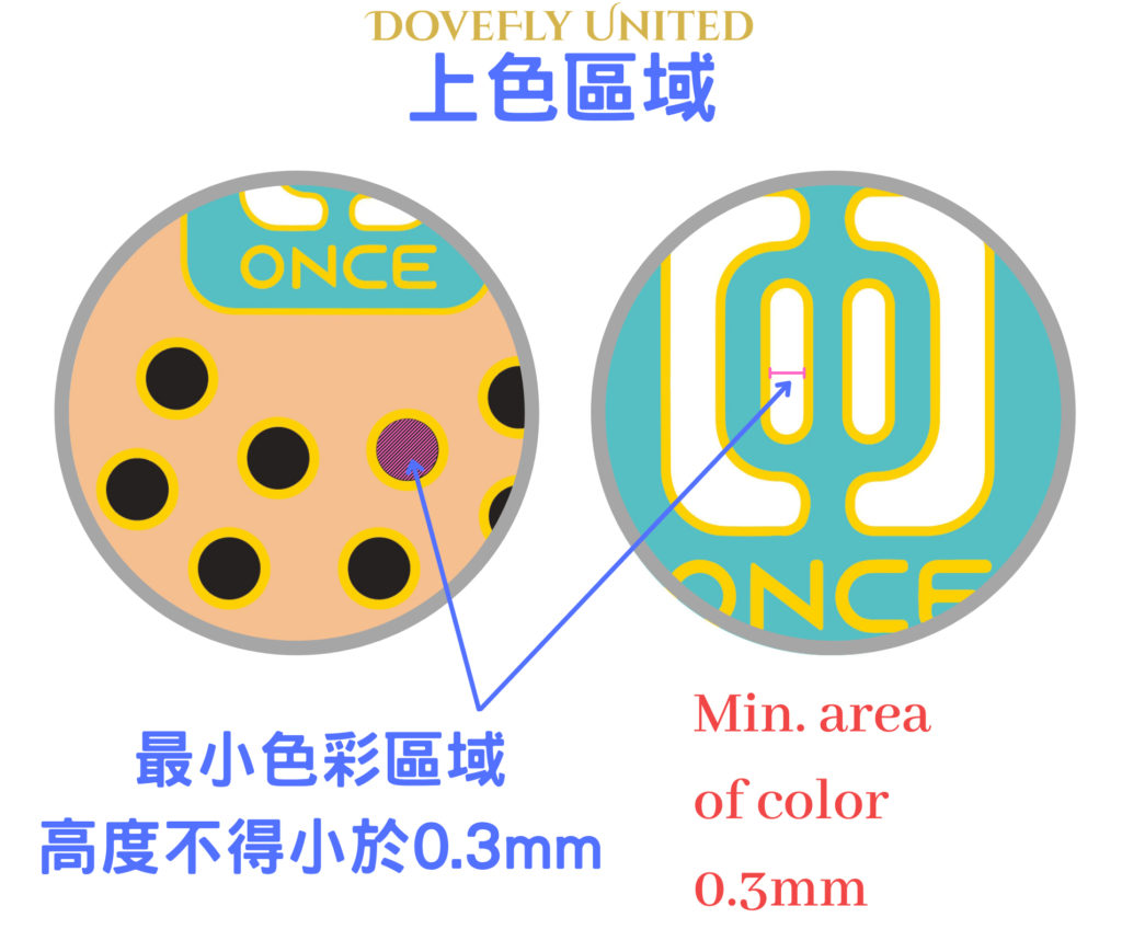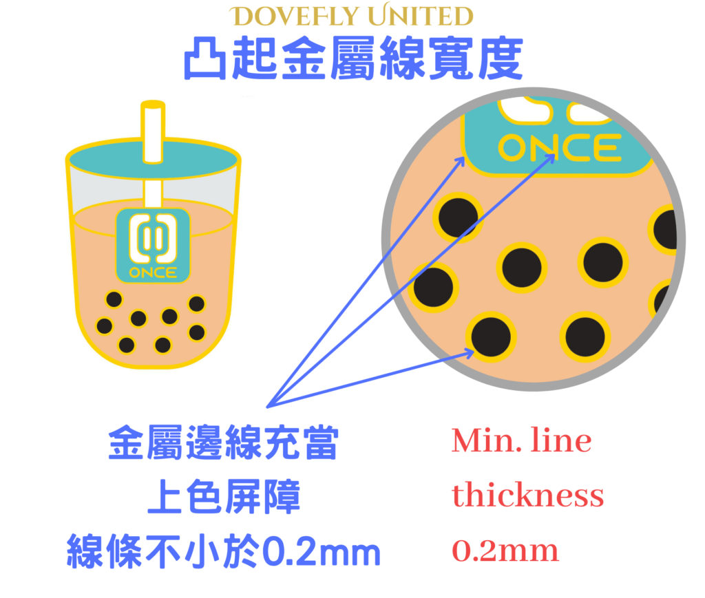 設計中的每種烤漆/琺瑯顏色都必須由一道凸起的金屬線隔開,該金屬線充當屏障,防止顏色混合在一起。 設計圖稿線應不小於0.2mm。