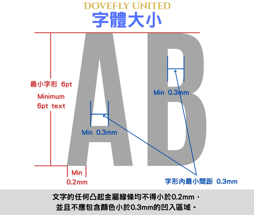 在設計中使用文字時,請確保遵循尺寸規則,以確保最小的凸起金屬線厚度和最小的填充顏色區域。