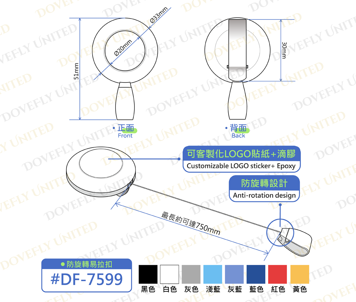 - 樣式: 33mm伸縮拉環 ABS繽紛色圓形易拉扣 伸縮扣、伸縮夾、易拉扣 (標準背夾)