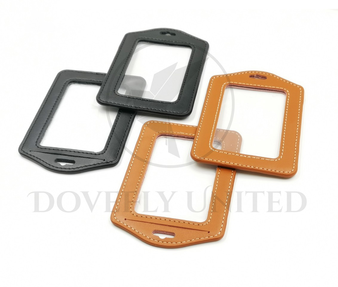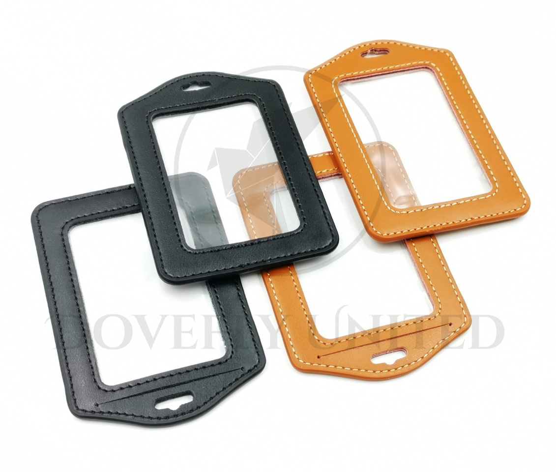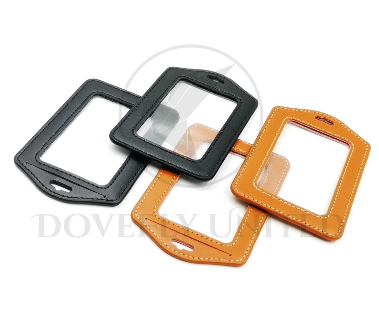 - 雙邊透明 牛皮手工識別證套 側邊開口 (直式; 單層)