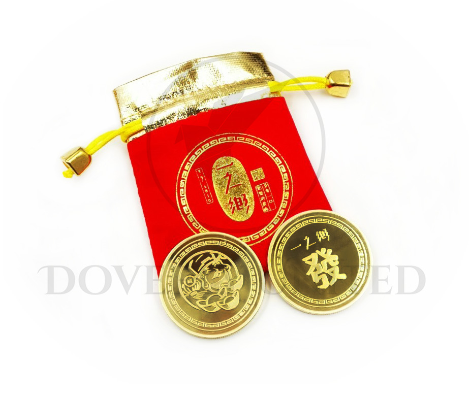 錢母錢幣壓克力盒+紅色招財絨布袋裝、錢幣製造紀念幣訂做、生肖新年紀念幣訂購找德弗聯合