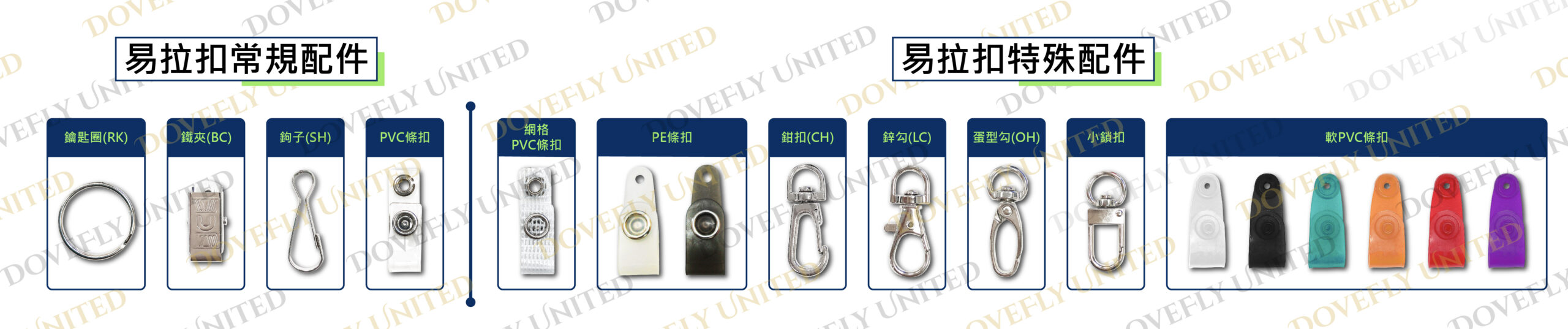 旋轉夾子 (BC) 10/15/20/25mm, 旋轉鉤子 (SH) 10/15/20/25mm, 鋅鉤 (LC) 10/15/20/25mm, 鑰匙圈 (KR) 10/15/20/25mm